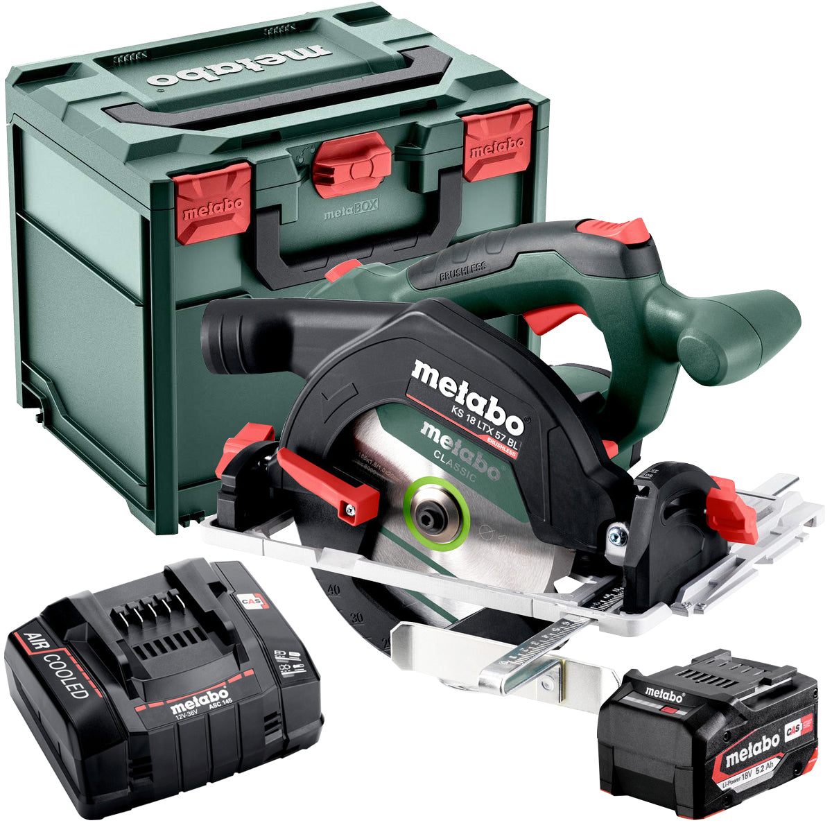 Metabo KS 18 LTX 57 BL 18V Brushless 165mm Circular Saw with 1 x 5.2Ah Battery Charger & Metabox