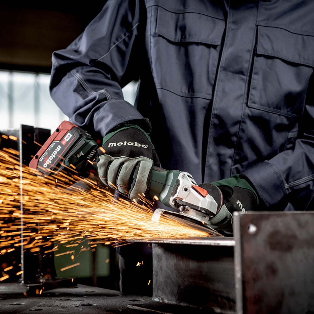 The Metabo WPB 18 LT BL 11-125 Angle Grinder is a high-performance cordless tool with the power equivalent to a 1100-watt mains-powered grinder, thanks to its efficient brushless motor. It features a paddle switch with a dead man function for enhanced safety, and a fast brake system that stops the disc within 1 second of switching off. The M-Quick system allows for tool-free disc changes, while the adjustable, twist-proof guard ensures user protection. Additionally, the grinder includes Metabo S-automatic mechanical safety clutch which minimise kick-back to the lowest level and a dust protection filter to safeguard the motor.