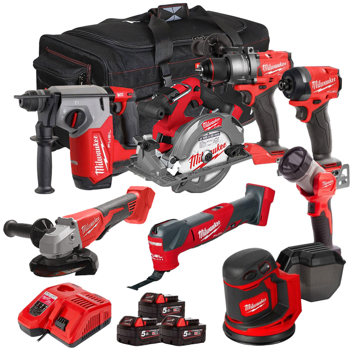 Milwaukee 18V Cordless 8 Piece Tool Kit with 3 x 5.0Ah Batteries & Charger in Bag T4TM-1